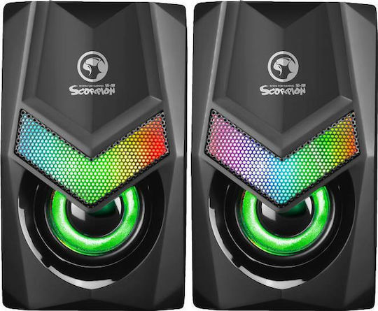 Gaming ηχεία Marvo SG118 με RGB φωτισμό. Χάρη στο μικρό τους μέγεθος είναι ο κατάλληλος σύντροφος τόσο για φορητούς υπολογιστές όσο και για επιτραπέζια συστήματα με περιορισμένο διαθέσιμο χώρο αφιερωμένο στα περιφερειακά.