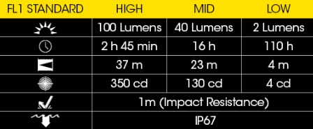 – Μέγιστη ένταση δέσμης φθάνει τα 350 κεριά και η μέγιστη απόσταση τα 37 μέτρα.