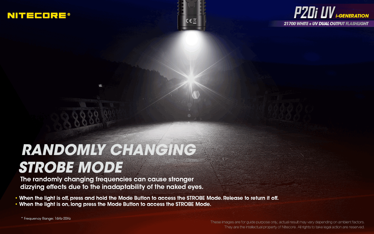 * Όταν ο φακός είναι ενεργοποιημένος, πιέστε παρατεταμένα τον ένθετο διακόπτη “MODE” για να μεταβείτε στην λειτουργία STROBE.
