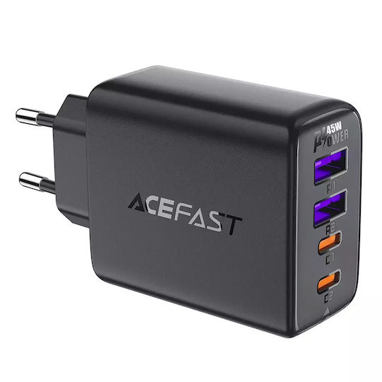 Φορτιστής Ταξιδίου Acefast A61 Fast Charging με 2xUSB-C + 2xUSB-A PD45W GaN Μαύρο