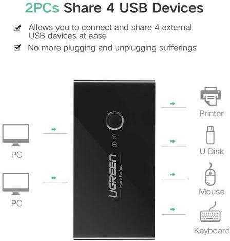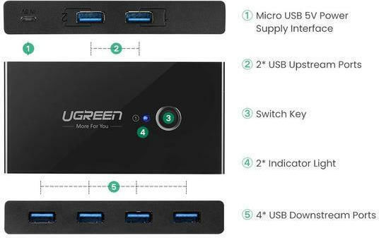 The UGREEN switch is a functional adapter with as many as four USB 3.0 inputs and two USB terminals, allowing you to connect the adapter to two different devices. It allows you to share access to four USB devices between two computers. The ideal solution for people who need to share USB devices between two computers.
